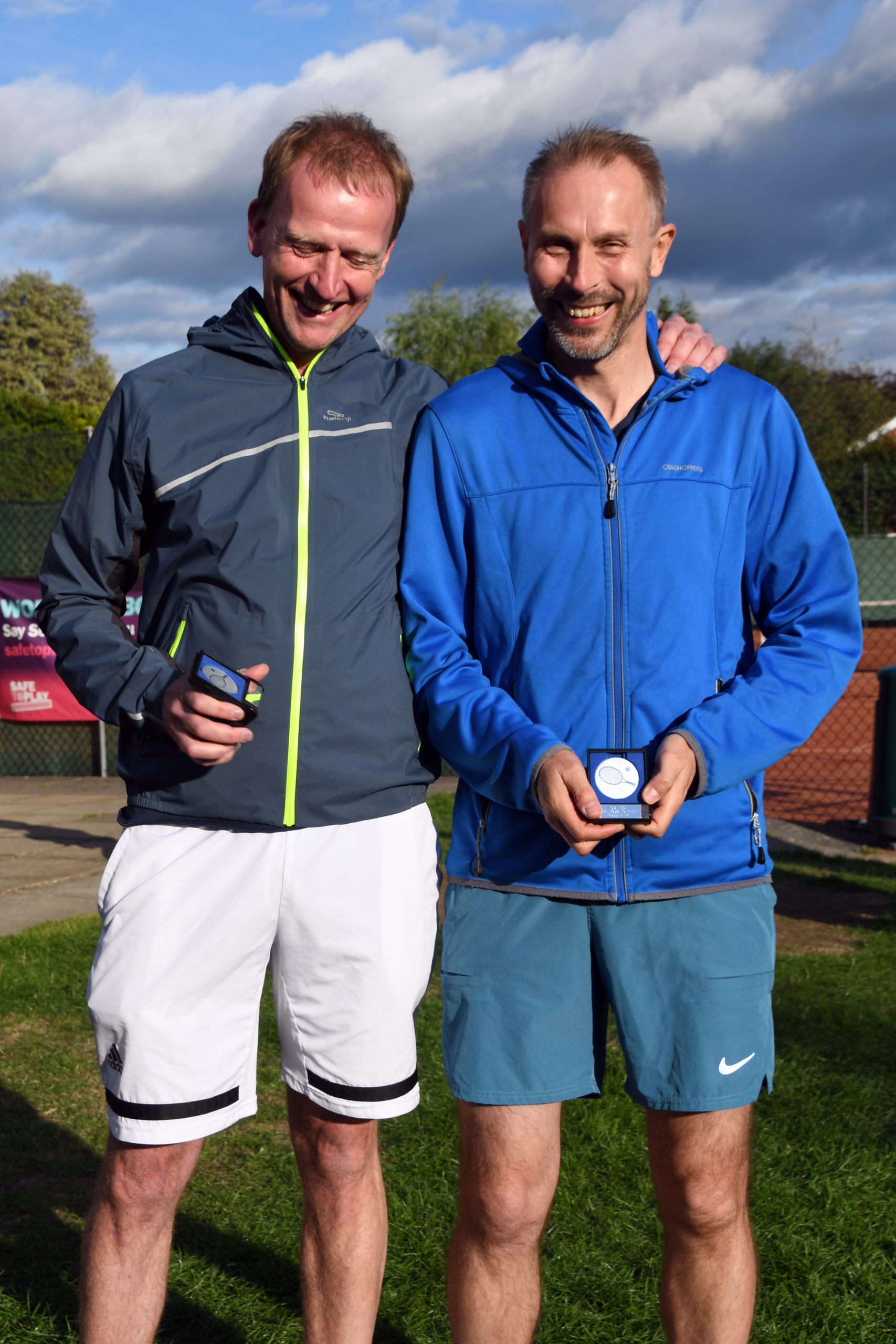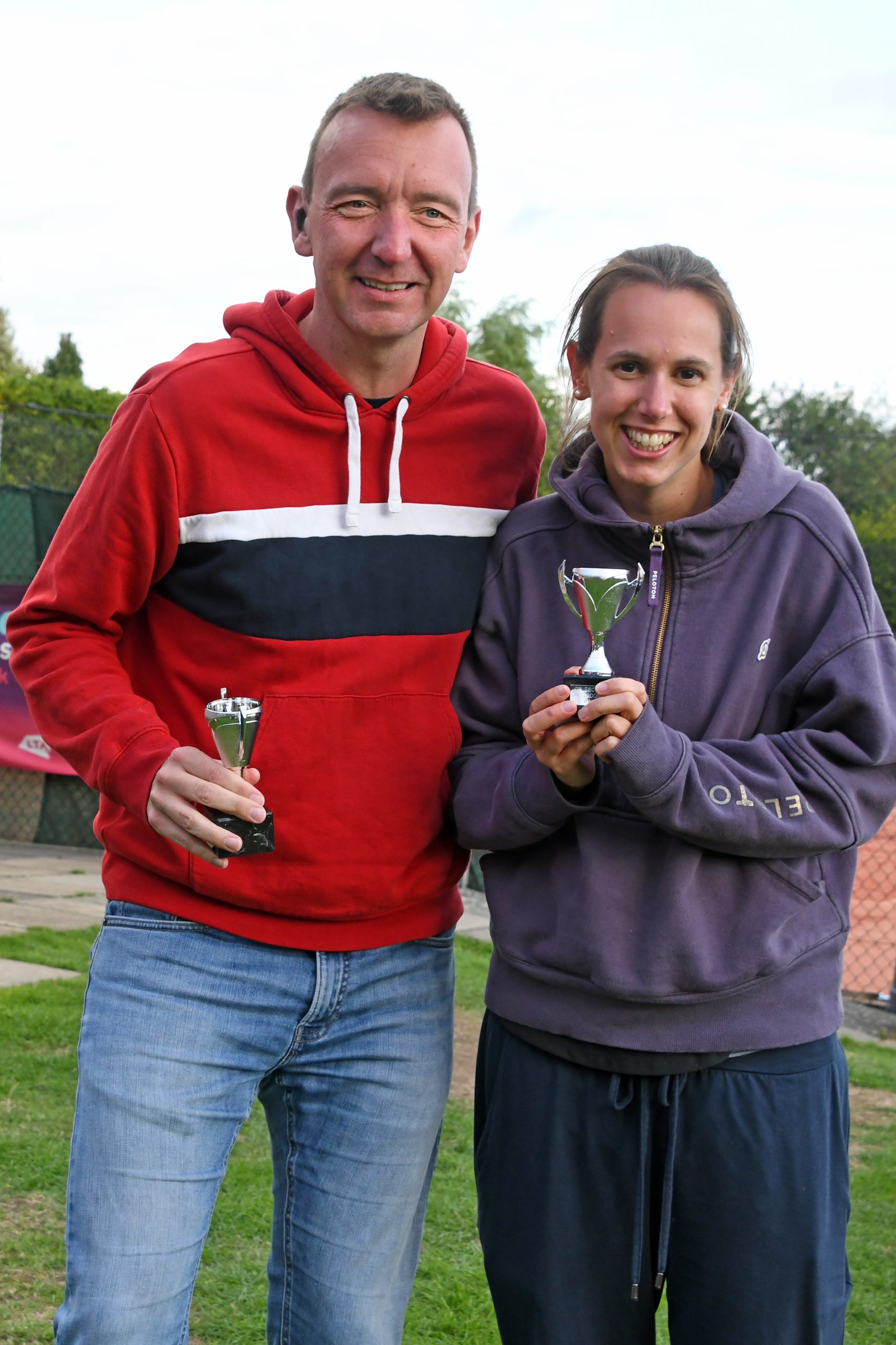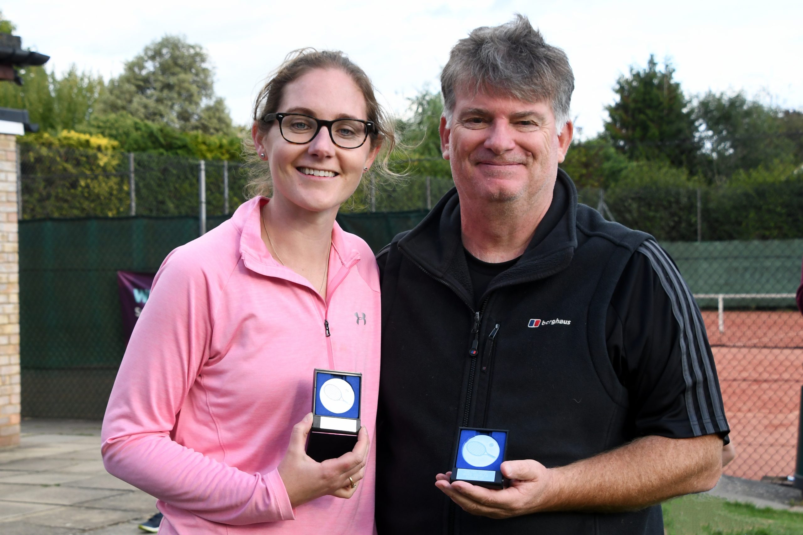 Paul Vicary and many times champion Stuart Foster faced each other in both the Mixed Doubles and Men’s Doubles finals. The Mixed was the first to be played in the morning and it turned out to be an epic struggle lasting over two hours. Paul and his partner Emily Koya took the first set 7-5, to which Stuart, playing with Sarah Skepper, responded by winning the second 6—4. The decider went all the way to a tie-breaker in which Paul and Emily triumphed giving them the title.